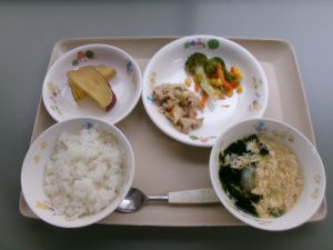 (昼食)ごはん、豚肉のしょうが焼き、ブロッコリーのサラダ、かきたま汁