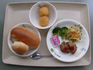 (昼食)ロールパン、ハンバーグ、キャベツのサラダ、ボイルブロッコリー