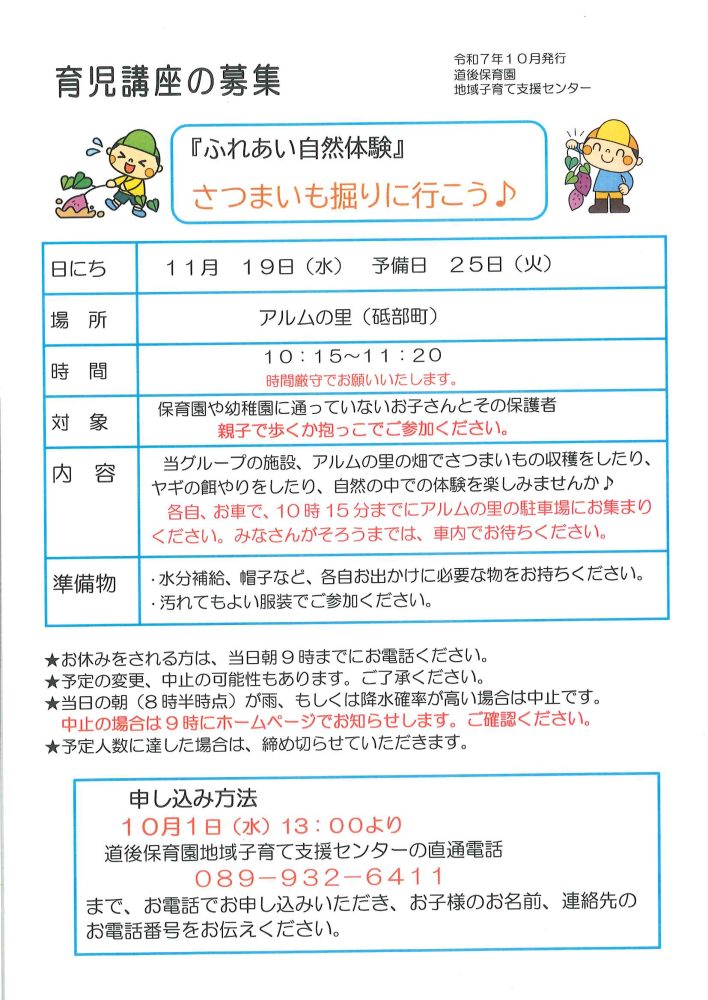 育児講座「ふれあい自然体験」さつまいも堀りに行こう♪