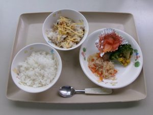 (昼食)ごはん、鶏肉と切り干しだいこんの煮物、ブロッコリーのごまあえ、トマト