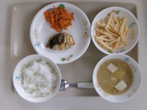 (昼食)ごはん、焼き魚、にんじんしりしり、さつまいものみそ汁