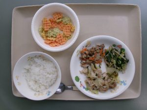 (昼食)ごはん、豚肉のしょうが焼き、青菜のおひたし、きのこのコンソメ炒め