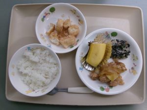 (昼食)ごはん、鶏肉の甘辛煮、ひじきのごまネーズ、バナナ