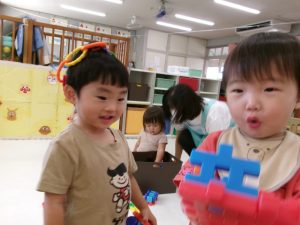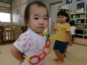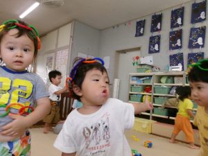 初めて見る輪っかのおもちゃに興味津々でしたが、遊び方が分からず長く繋げたのをくるくる回して遊んでいました。一人頭の上にのせてあげると、その姿を見て「やって、やって!」とみんな頭にのせたり、ベルトやたすきにしたりしてプチファッションショーのようでした。なかにはポーズを決める子もいましたよ!
