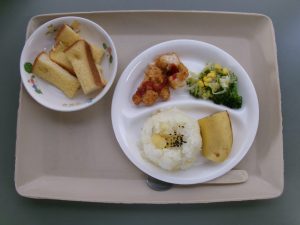 (昼食)さつまいもごはん、ささみカツ、グリーンフレンチサラダ、バナナ