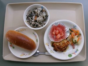 (昼食)ロールパン、鶏つくねハンバーグ、リヨネーズポテト、トマト
