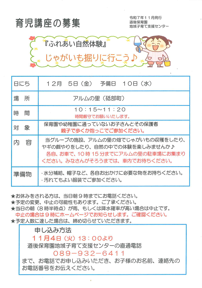 育児講座「ふれあい自然体験」じゃがいも堀りに行こう♪
