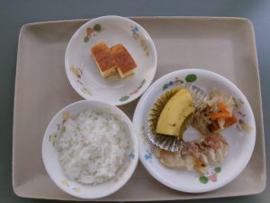 (昼食)ごはん、魚のから揚げ 、かぼちゃのうま煮、バナナ