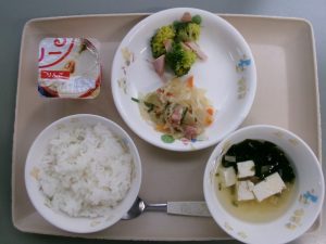 (昼食)ごはん、チャプチェ風、ブロッコリーとハムのマリネ、豆腐のすまし汁