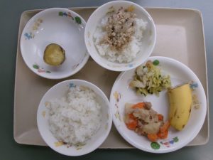 (昼食)ごはん、豚肉とじゃがいものうま煮、キャベツとちくわの酢物、バナナ