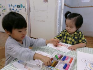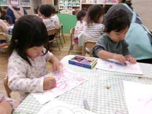 ♪どんな色が好き?と歌いながら、いろいろな色で塗り、オリジナルのお面ができました。