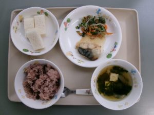 (昼食)赤飯、魚のみそ煮、青菜ともやしのおかかあえ、豆腐とえのきのすまし汁