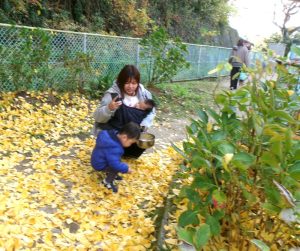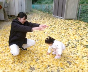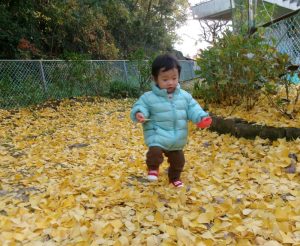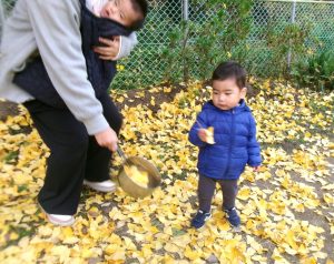 気が付くと、イチョウの葉っぱが敷き詰められ、黄金の道になっている所がありました!(^^)! 先月遊んだ時はキンモクセイが花盛りでしたね♡♡季節の移り変わりを感じました☆彡葉っぱを踏みしめたり、触ったり、ひらひらしたり、楽しかったね❤