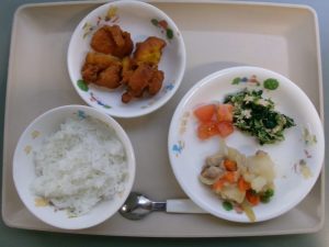 (昼食)ごはん、肉じゃが、もやしの彩りあえ、トマト
