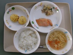 (昼食)ごはん、魚のマヨネーズ焼き、白菜のおかか和え、卵のコンソメスープ