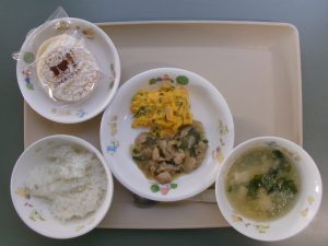 (昼食)ごはん、鶏肉の香味焼き、かぼちゃサラダ、豆腐とじゃがいものみそ汁