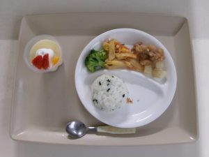 (昼食)わかめごはん、鶏肉のたつた揚げ、マカロニのケチャップあえ、ブロッコリー