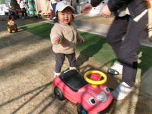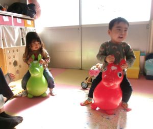 今日は、お天気が良く、外遊びが楽しい天候でした♡♡保育園の園児さん達も外遊びを楽しんでいたので、近い年齢の園児さん、また大きい園児さんの遊びを見ながら、いっぱい遊びました✨この後、センタールームでも、遊びました🌟馬がモチーフの乗り物おもちゃに乗ったりコマを作って遊んだりもしましたよ💐