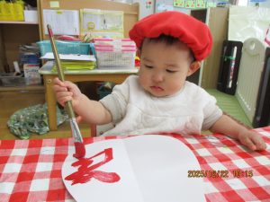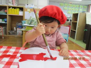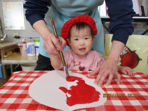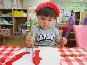 新年に向けて、制作を楽しみました。発表会の「だるまさん」の帽子をかぶり、絵描きさん風の装いで。(笑)筆を持ち、のびのびと自由に動かし、だるま型の画用紙に赤色の絵の具を塗り塗り塗り・・・。「だーるーまーさーんーが・・」とつぶやき、絵本や発表会を思い出しながら楽しむ子ども達でした。