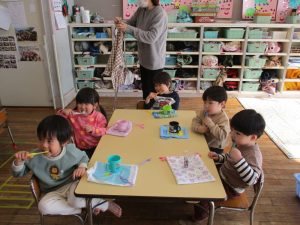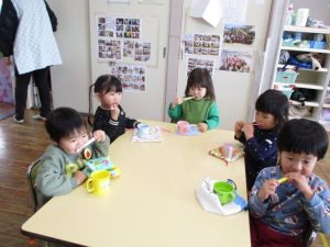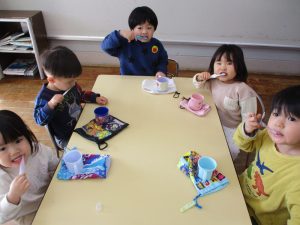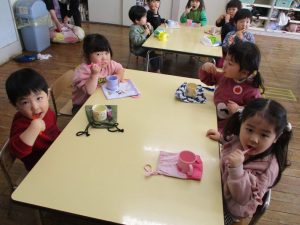 意気に入りの歯ブラシ、コップを用意してもらってやる気満々のりんご組さん