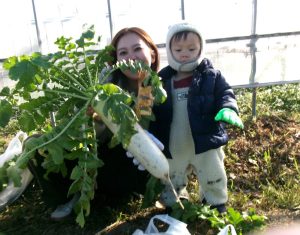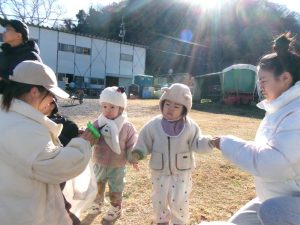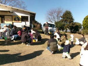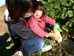 1月14日(火)に砥部町にあるアルムの里の農園に遊びに行き、大根の収穫とヤギの餌やり体験を楽しみました☆抜けるように青い空がきれいな好天で、親子さん、みんな張り切って畑に向かいました☺手袋もして準備万端です✌