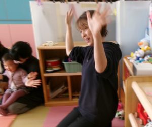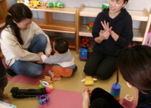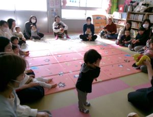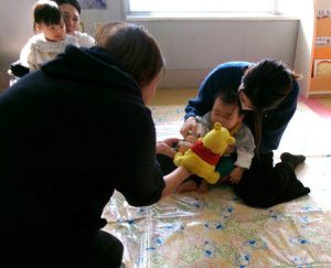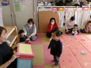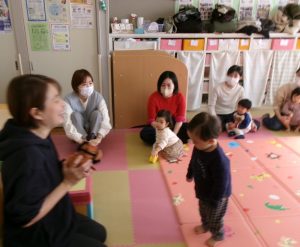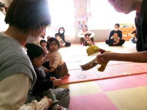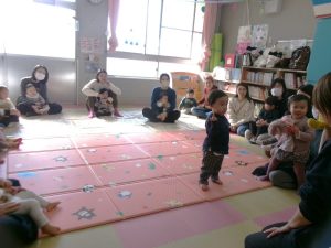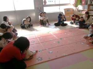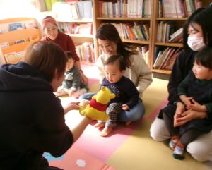 1月16日(金)に道後保育園の支援センタールームで英語にふれて遊ぶ講座がありました♪講師は園の専任英語講師、土居真由美先生です。先生を囲んで輪になったら、みんなで寝ているプーさんを起してあげましょう❣「一緒に起きようよ🌟」