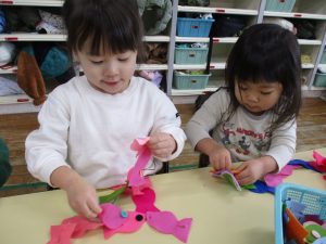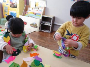 遊びの中でボタンの練習をしています。『ボタンホールにボタンを入れる』という単純な動作ですが、これが子ども達にとっては難しく、始めた頃はイライラしたり、途中であきらめたりしてる姿もありましたが、少しづつコツがわかり、今では長くつなげることができるようになっています。
