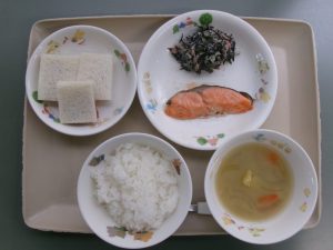 (昼食)ごはん、焼き魚、ひじきのごまネーズ、さつまいものみそ汁