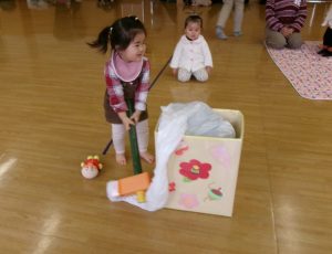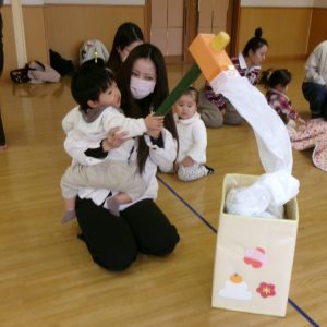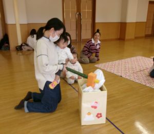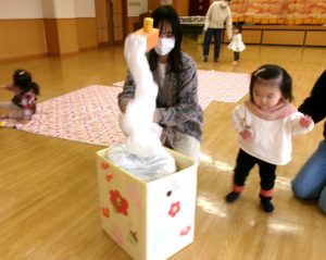 1月のふれあい広場は、お正月遊びを楽しんでいます💖お餅つきをしてみましょう(^^♪「ぺったんぺったんこ!」つきあがると、伸びるよ~(^_-)-☆