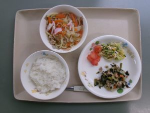 (昼食)ごはん、豚肉と青菜の中華炒め、キャベツの酢もの、トマト