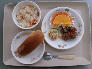 (昼食)ロールパン、ハンバーグ、さつまいもサラダ、みかん