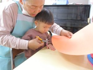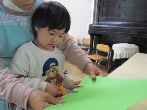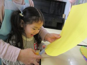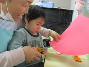はさみを使って1回切りの制作をしました。 はさみに興味津々の子ども達。最初は保育士と一緒にはさみを切っていき、