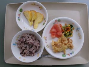 (昼食)赤飯、かき揚げ、彩りあえ、トマト