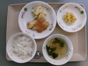 (昼食)ごはん、魚のオニオンソースかけ、ポテトサラダ、はるさめときのこのスープ