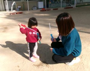 今日はよく晴れてシャボン玉もピカピカ光るよ(^_-)-☆