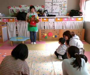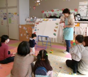 今日は、絵本、大型絵本や手袋シアター、パネルシアターなどで、お話あり歌ありで見て聞いて楽しい会でした(^^♪