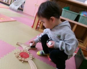 支援センタールームでは、絵本の貸し出しもしています🌟好きな絵本を見つけてね❤「がたんごとんがたんごとん」の絵本が大好きなお友達は電車遊びも大好き☆彡