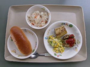(昼食)ロールパン、ひじき入りハンバーグ、コーンサラダ、バナナ