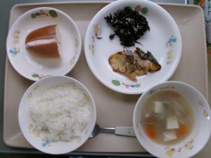 (昼食)ごはん、魚のごまみそ焼き、ひじきの中華あえ、豚汁
