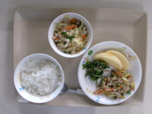 (昼食)ごはん、豚肉のしょうが焼き、青菜ときのこのおひたし、りんご