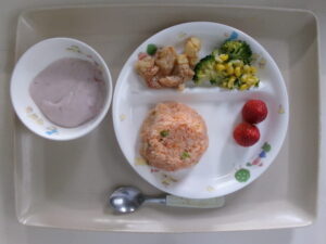 (昼食)ケチャップライス、鶏肉のから揚げ、ブロッコリーのサラダ、いちご