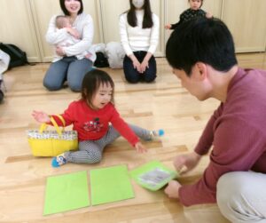体操で、体をよーく動かしたら、次は「なりきりかけっこ❣」カンガルーのカードが出たら抱っこ、コアラはおんぶ、ウサギはジャンプですよ(*^^*)