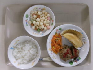 (昼食)ごはん、ハンバーグ、にんじんしりしり、りんご