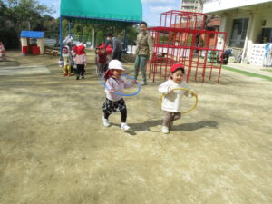 フラフープをバトンにして、リレーごっこをしています。