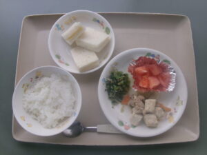 (昼食)ごはん、肉豆腐、青菜の磯浸し、トマト