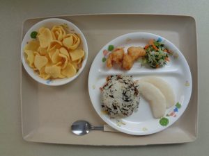 ひじきの炊き込みご飯、魚のたつた揚げ、キャベツのゆかりあえ、なし