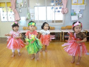 腰ミノ、レイをつけて、フラダンスをしました。 音楽がかかると腰をフリフリ♪ 笑顔で踊っていました。 「こうやっておどるんよ!!」と先生たちにも教えてくれるほど、興味をもって楽しんでいました。